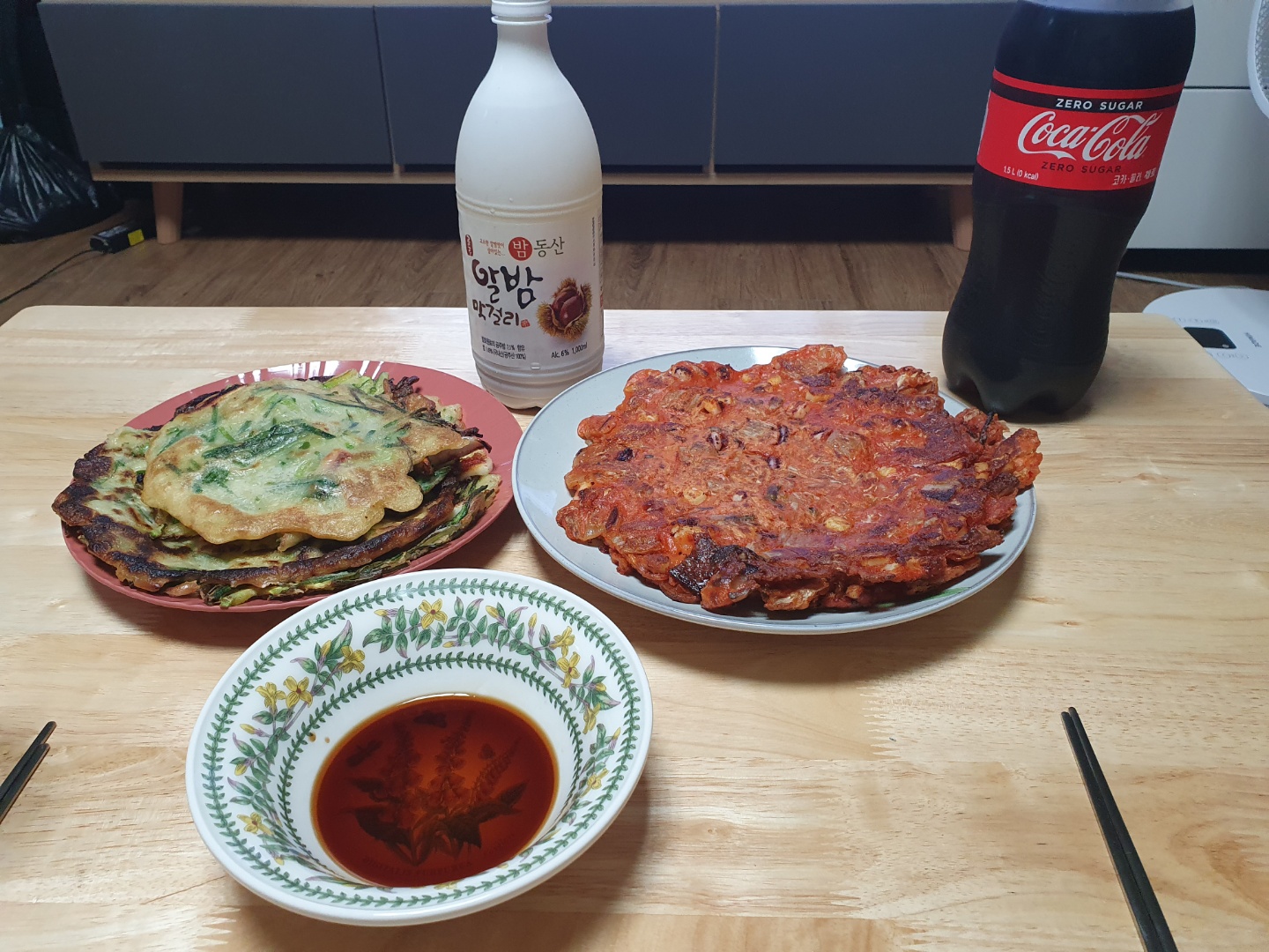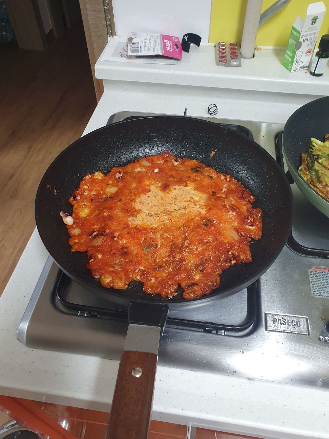 다행히 큰 프라이팬이 두 개라서 이렇게 양쪽에다 놓고서 부쳤어요.